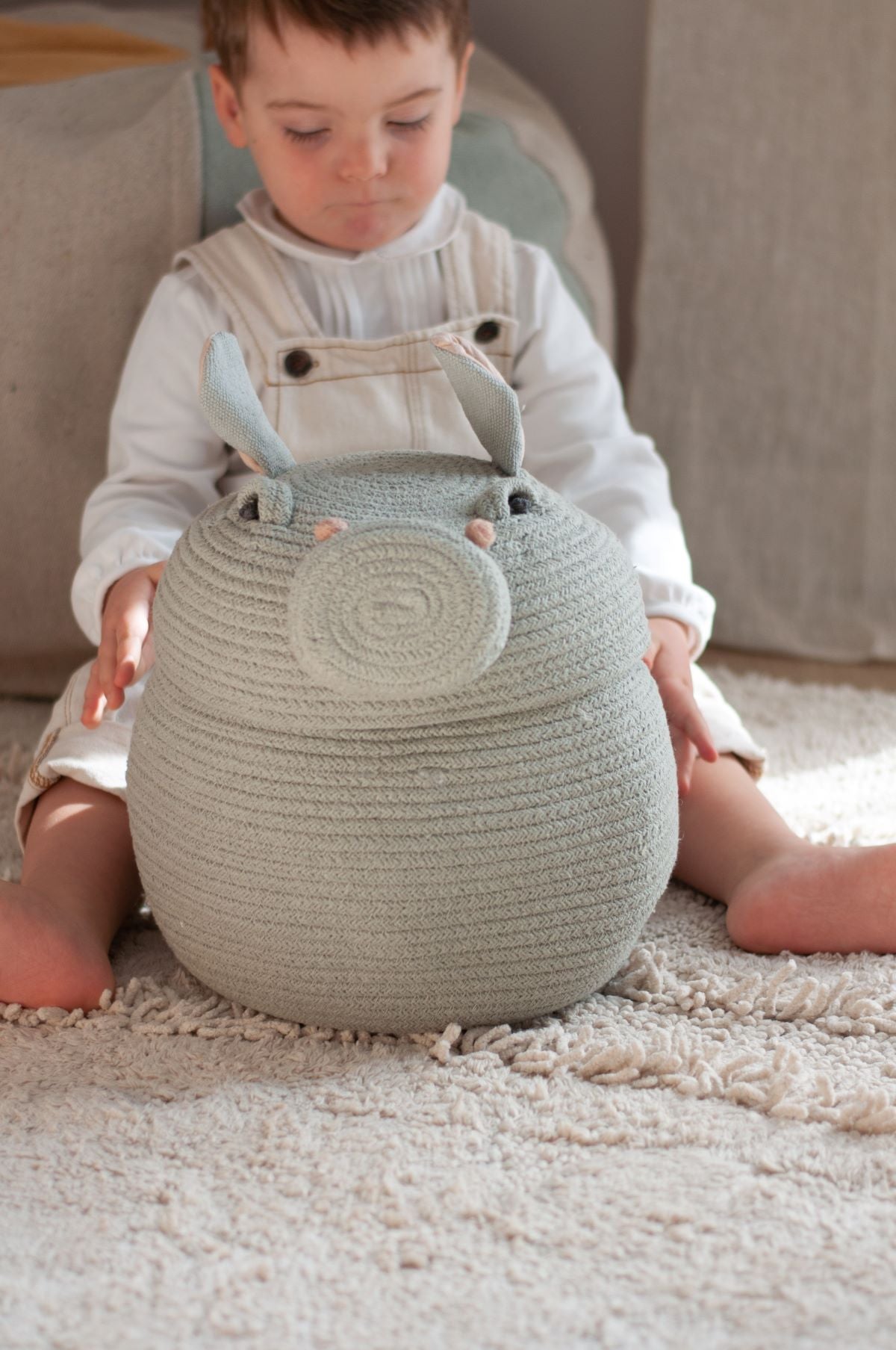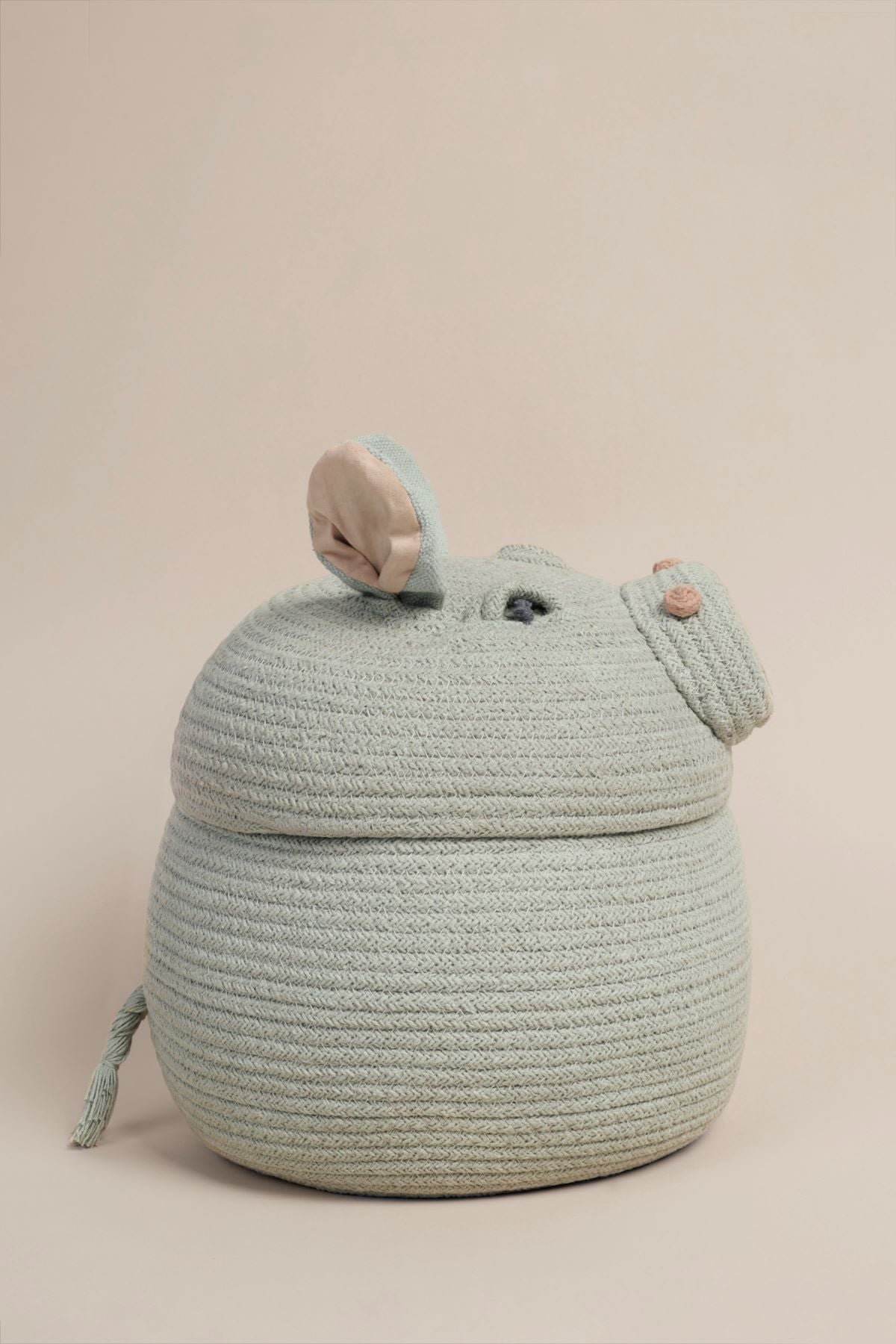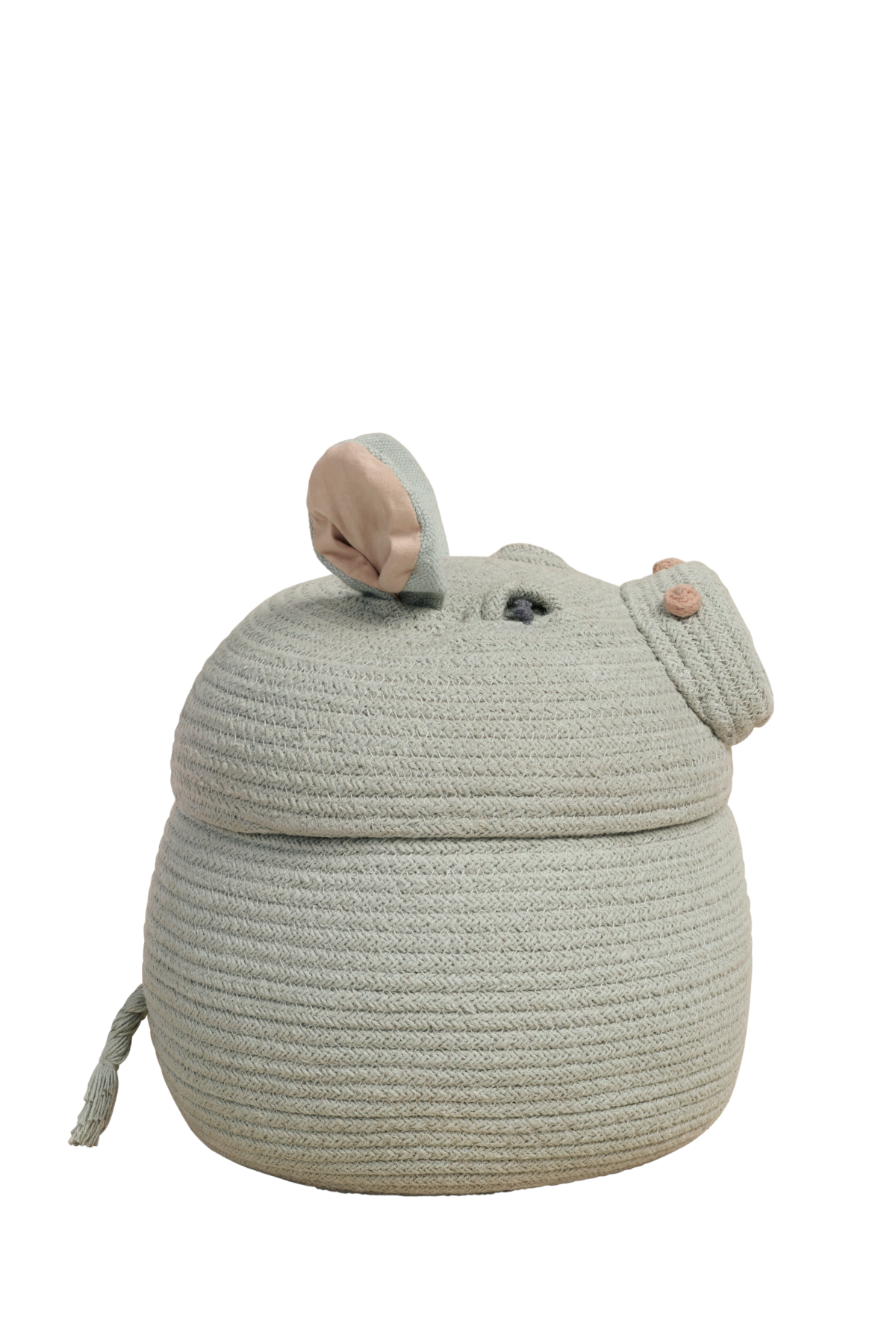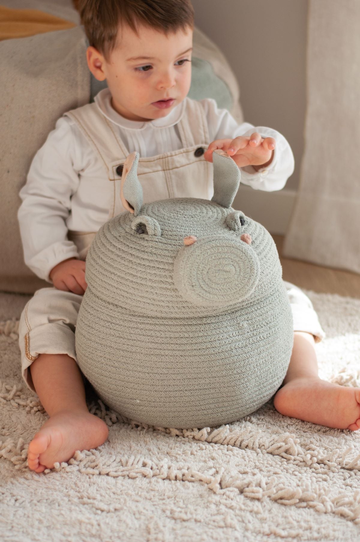 As happy as a Hippo! With a slightly round-shaped lid, the Henry the Hippo basket is handcrafted using a braided cord made of fibers from recycled PET bottles mixed with our Blue Sage cotton. With ears in matching color canvas and knotted pink nostrils, your hippo friend will keep your little treasures safe.