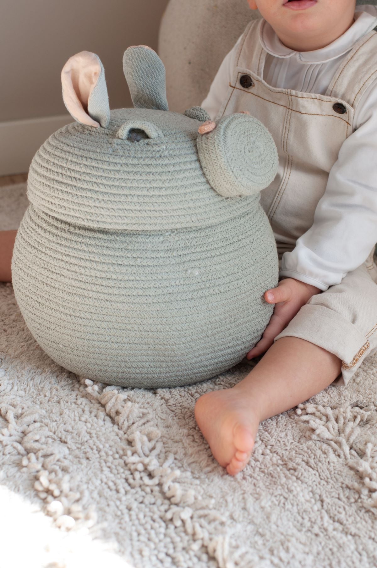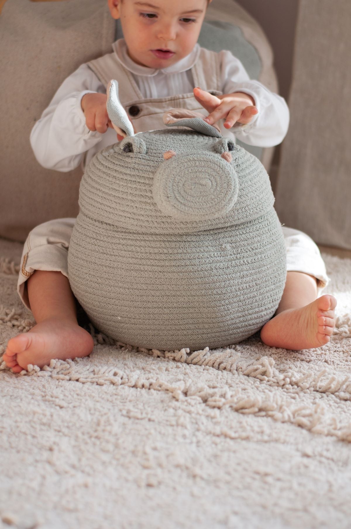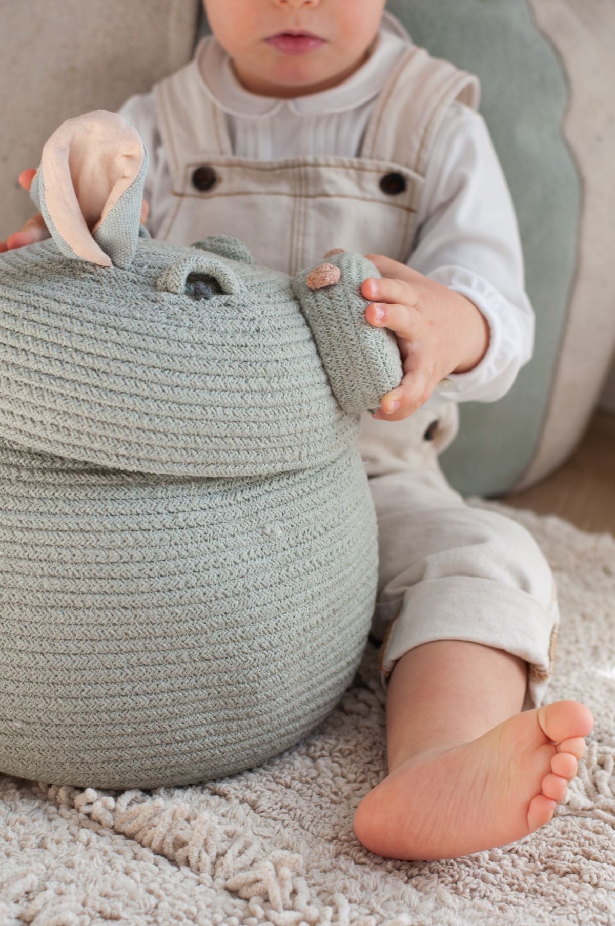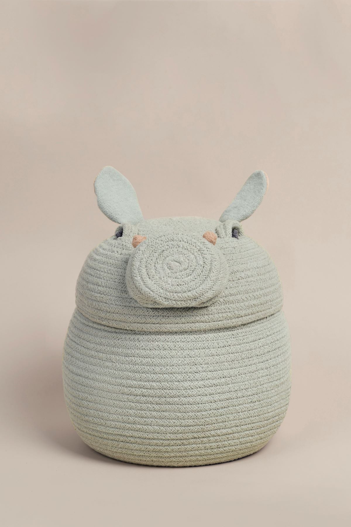 As happy as a Hippo! With a slightly round-shaped lid, the Henry the Hippo basket is handcrafted using a braided cord made of fibers from recycled PET bottles mixed with our Blue Sage cotton. With ears in matching color canvas and knotted pink nostrils, your hippo friend will keep your little treasures safe.