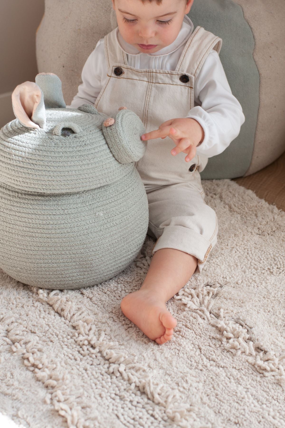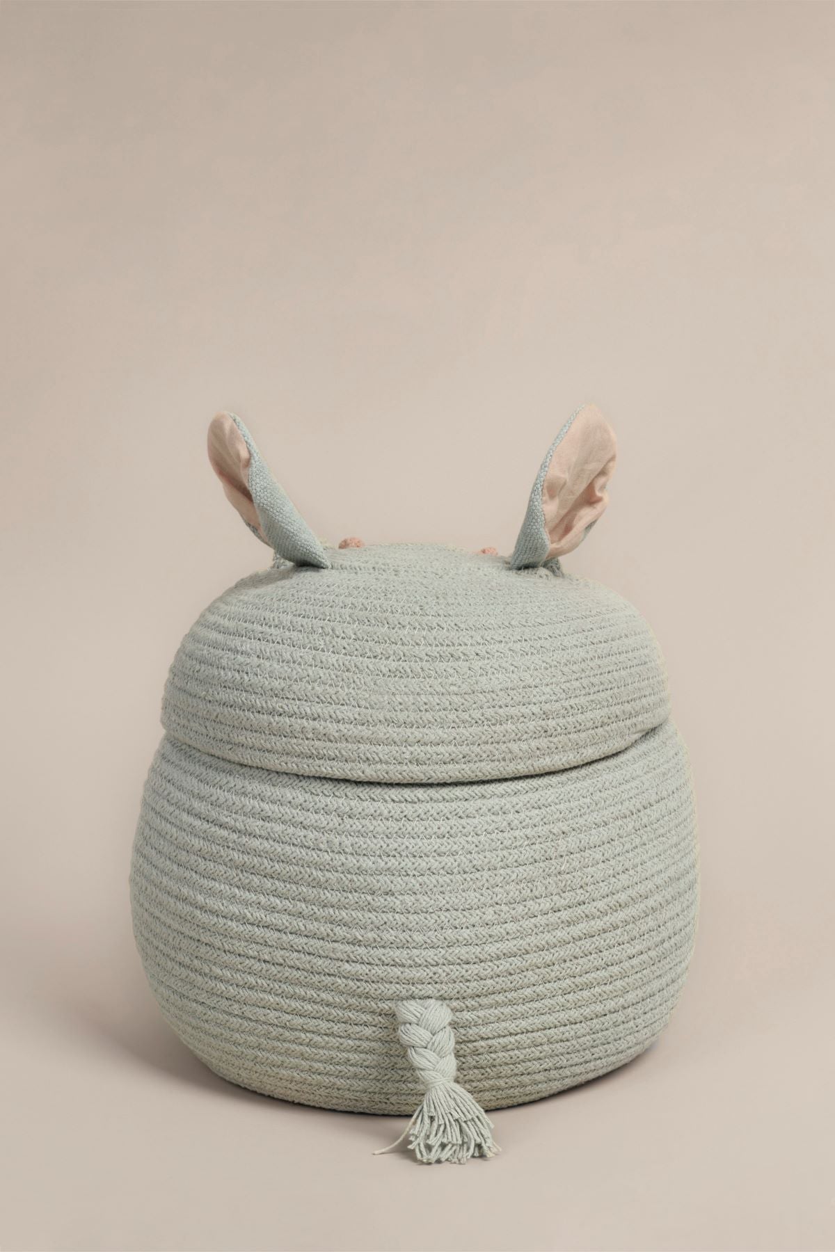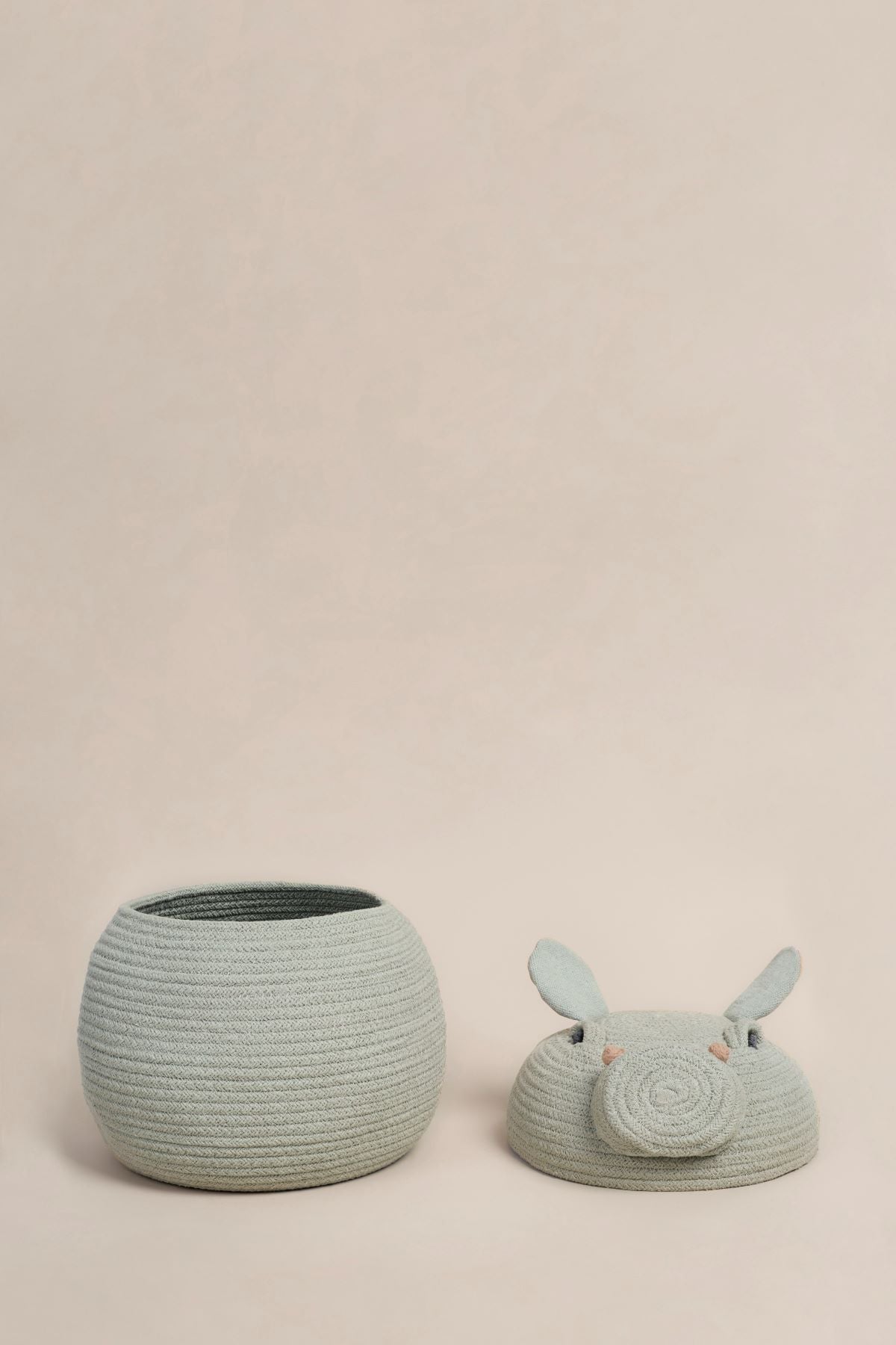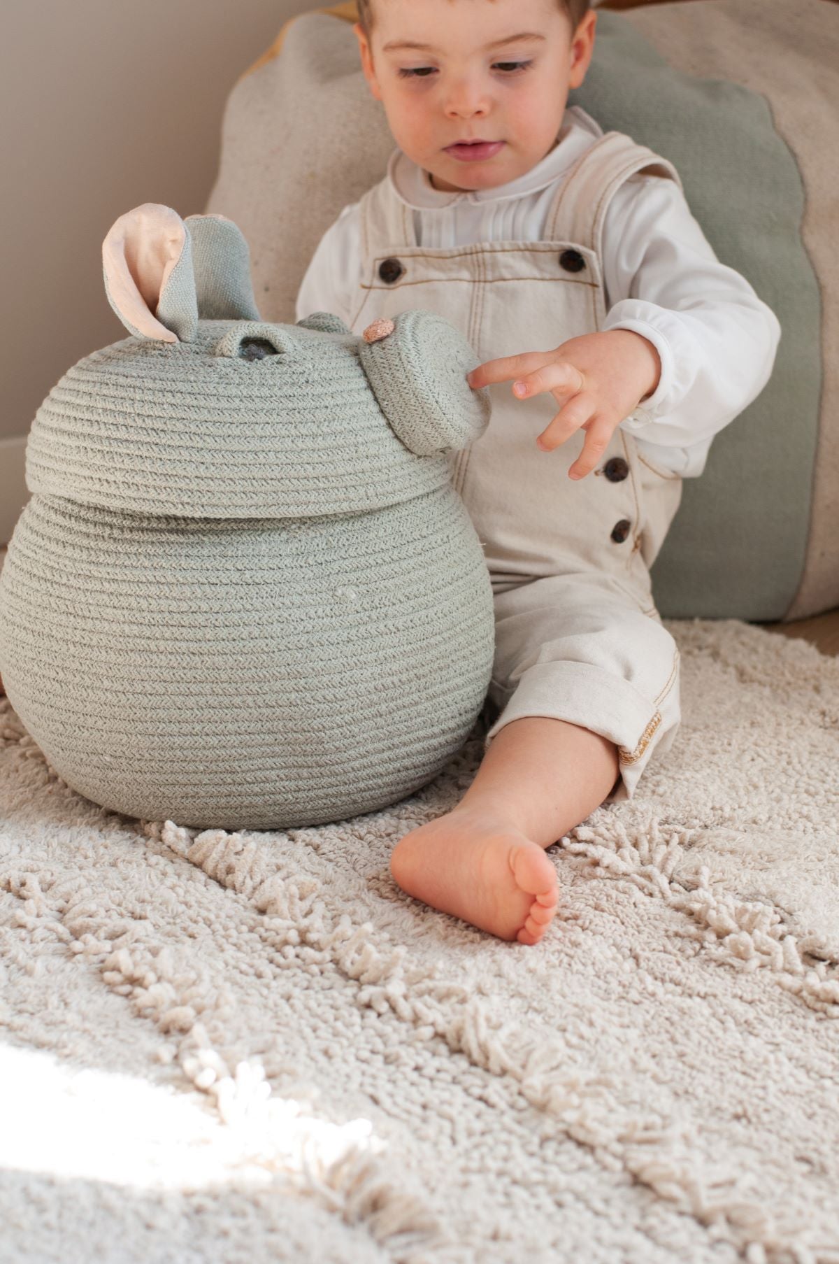 As happy as a Hippo! With a slightly round-shaped lid, the Henry the Hippo basket is handcrafted using a braided cord made of fibers from recycled PET bottles mixed with our Blue Sage cotton. With ears in matching color canvas and knotted pink nostrils, your hippo friend will keep your little treasures safe.