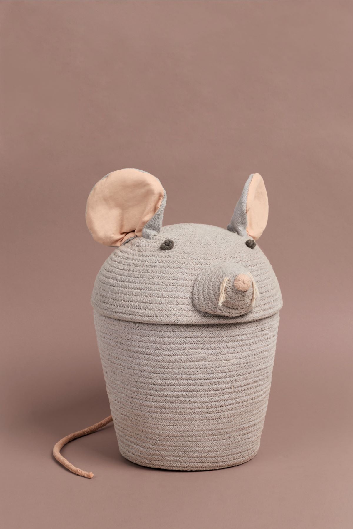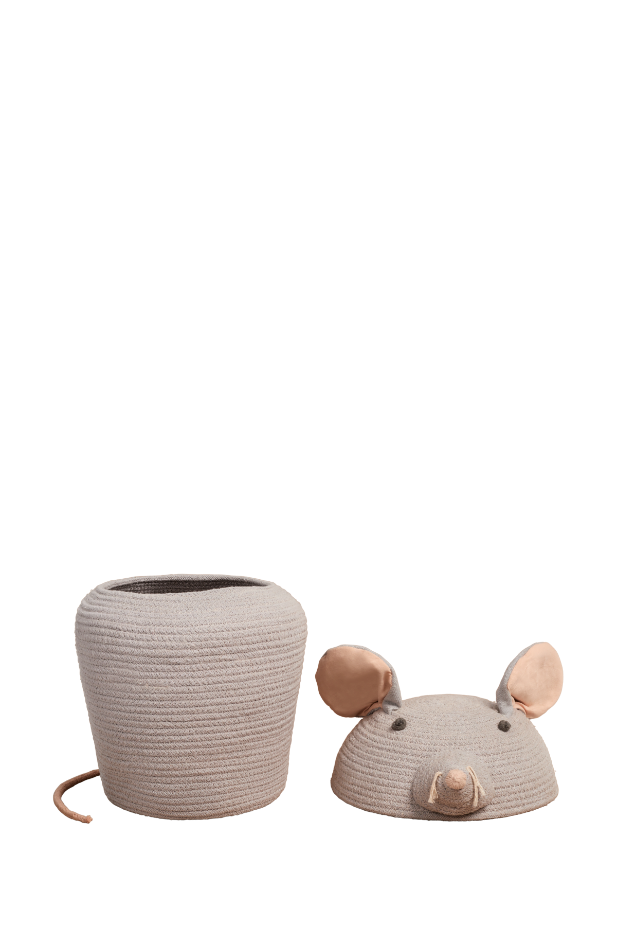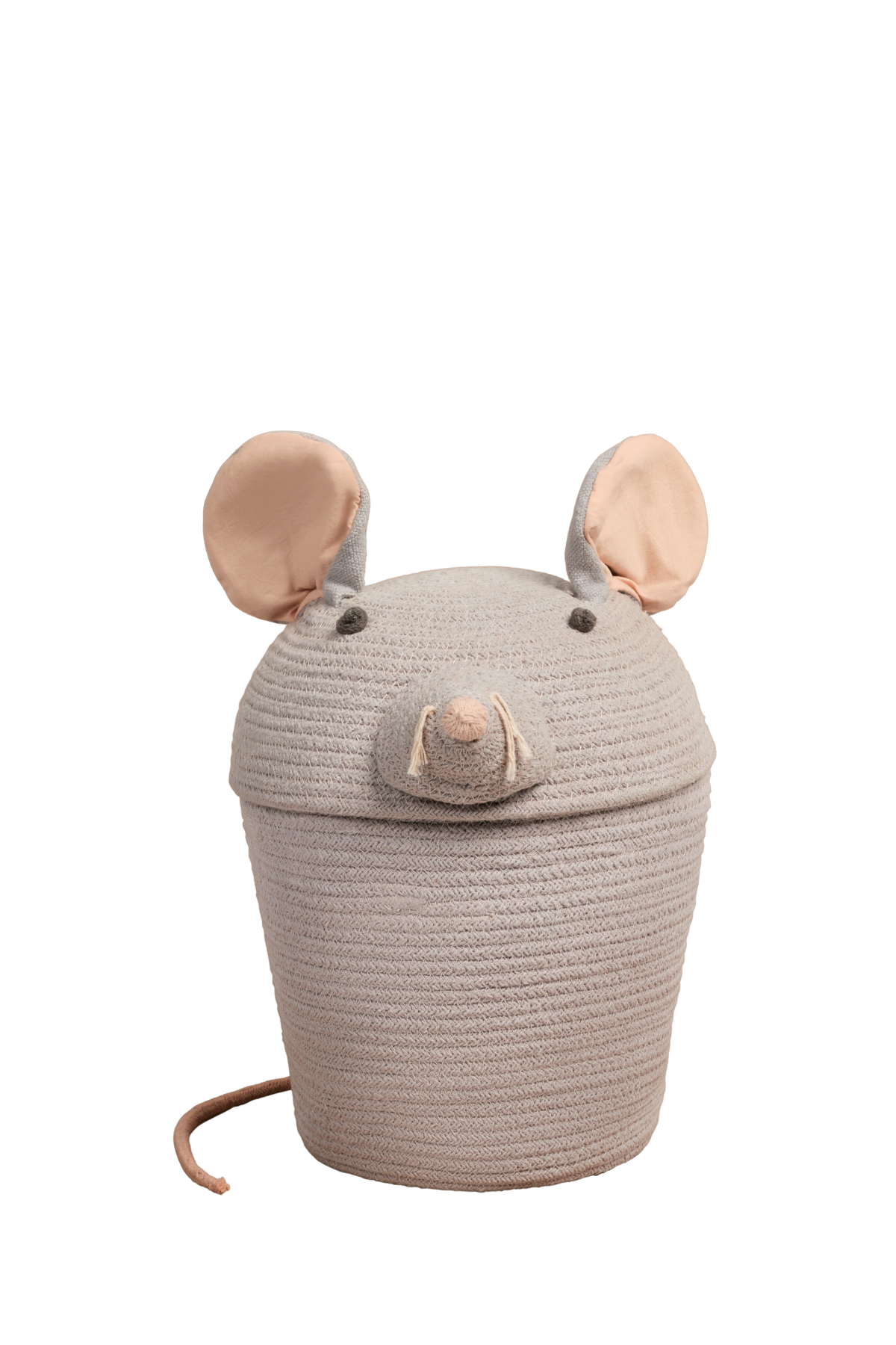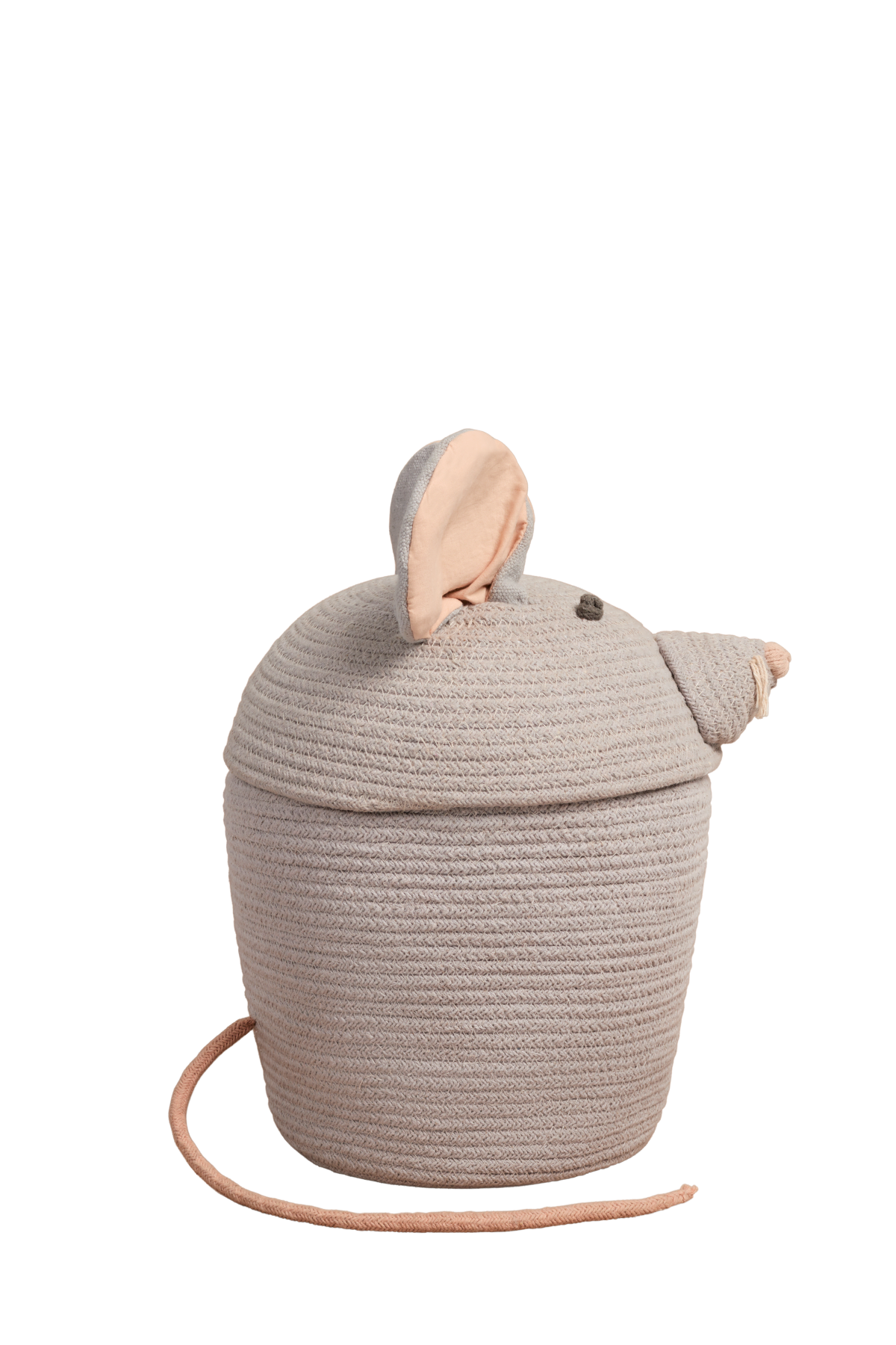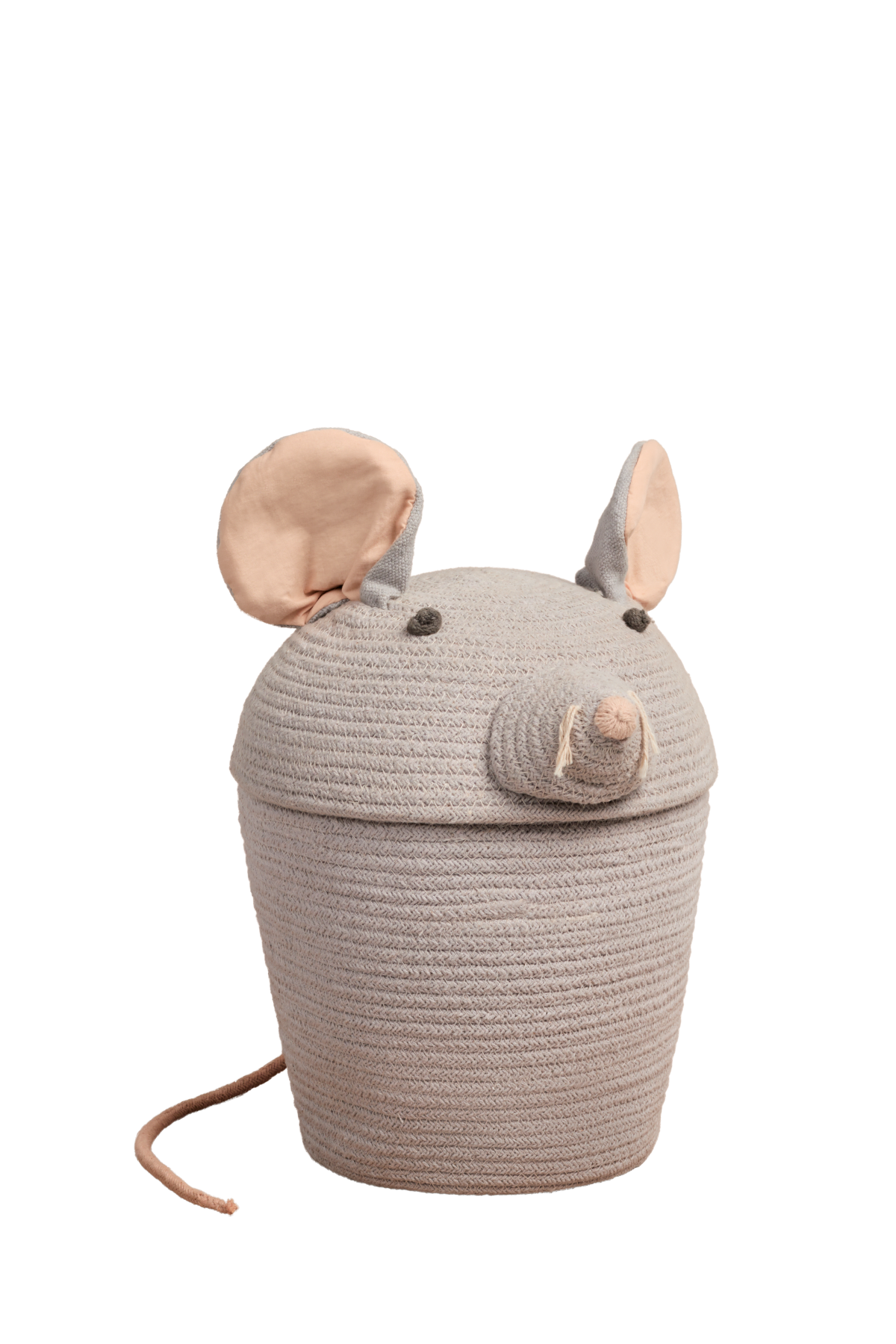 Curious as a rat, the Renata the Rat basket is handcrafted using braided cords made of fibers from recycled PET bottles mixed with our cotton colors. With a slightly cone-shaped bottom part in Pearl Grey color and an embroidered pointy nose, the gray canvas ears and the pink long tail gives the final touch to this basket.