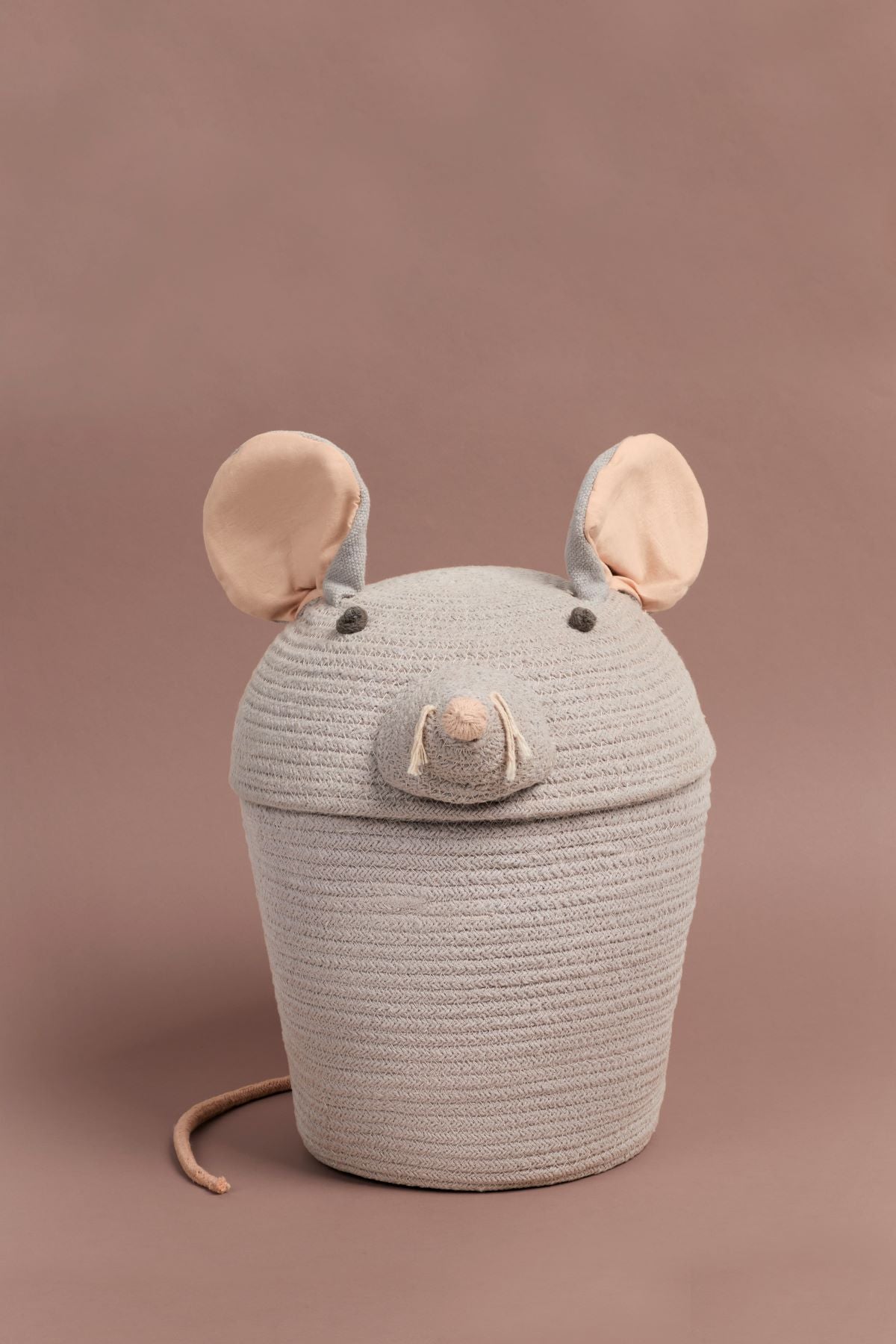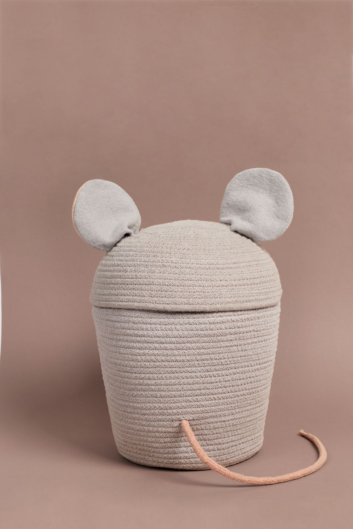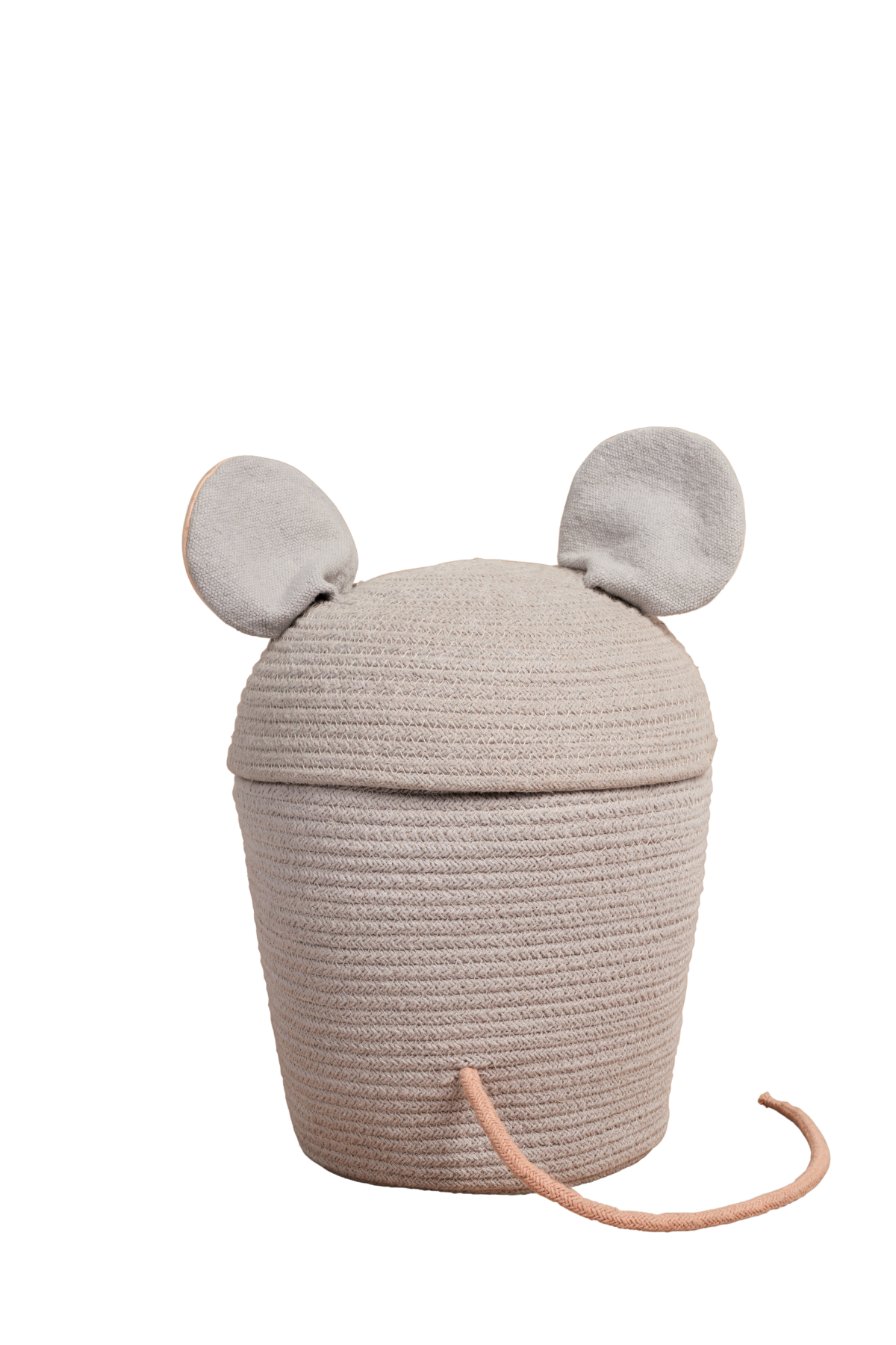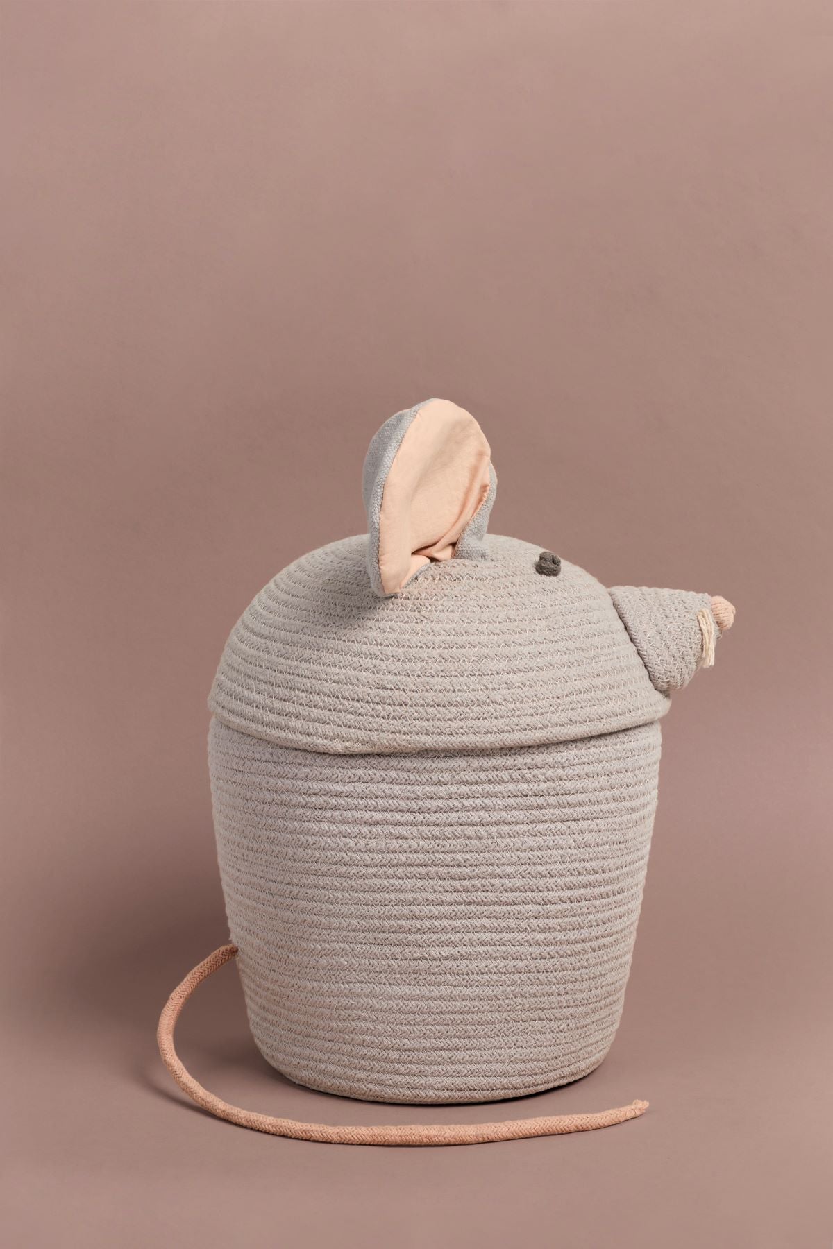 Curious as a rat, the Renata the Rat basket is handcrafted using braided cords made of fibers from recycled PET bottles mixed with our cotton colors. With a slightly cone-shaped bottom part in Pearl Grey color and an embroidered pointy nose, the gray canvas ears and the pink long tail gives the final touch to this basket.