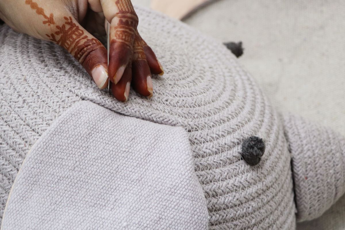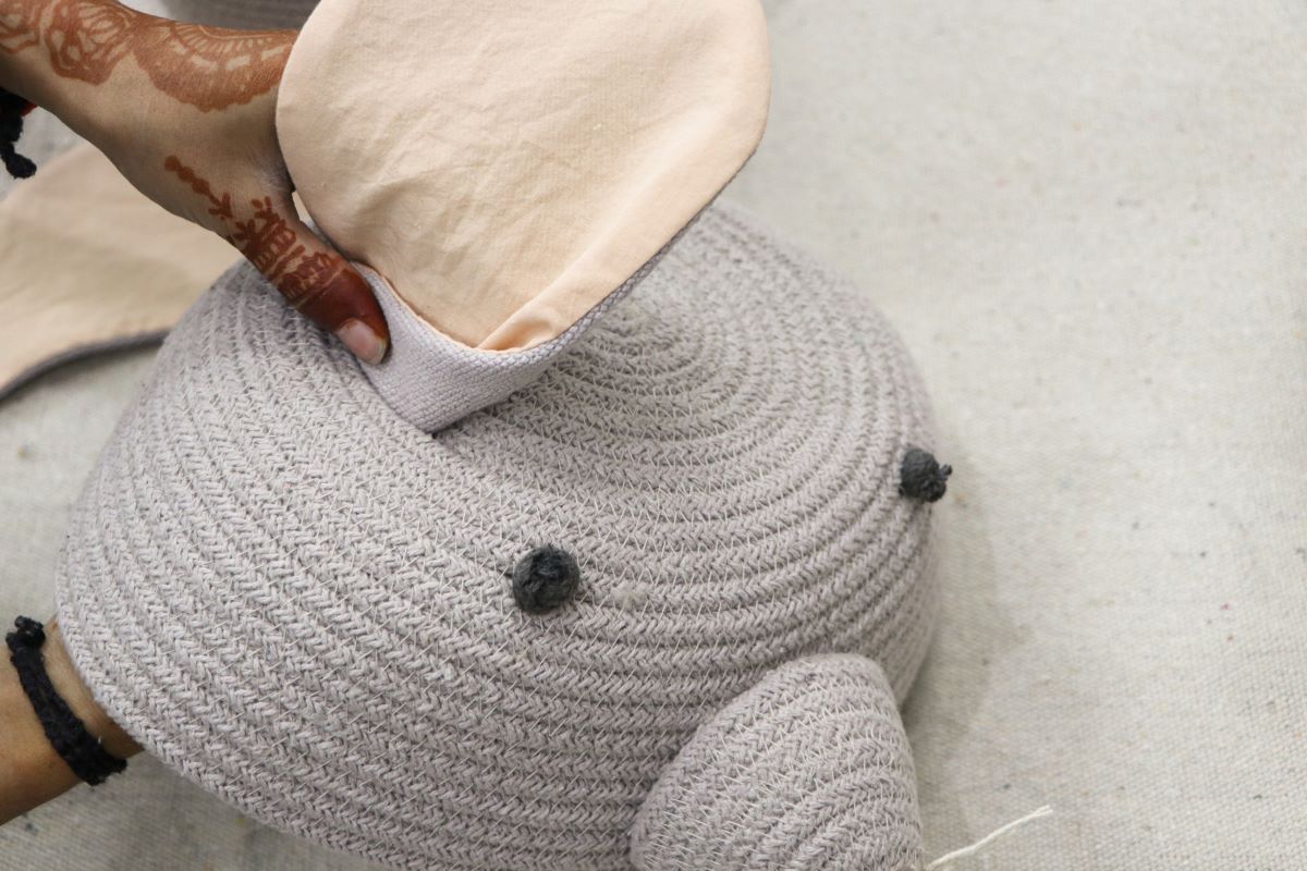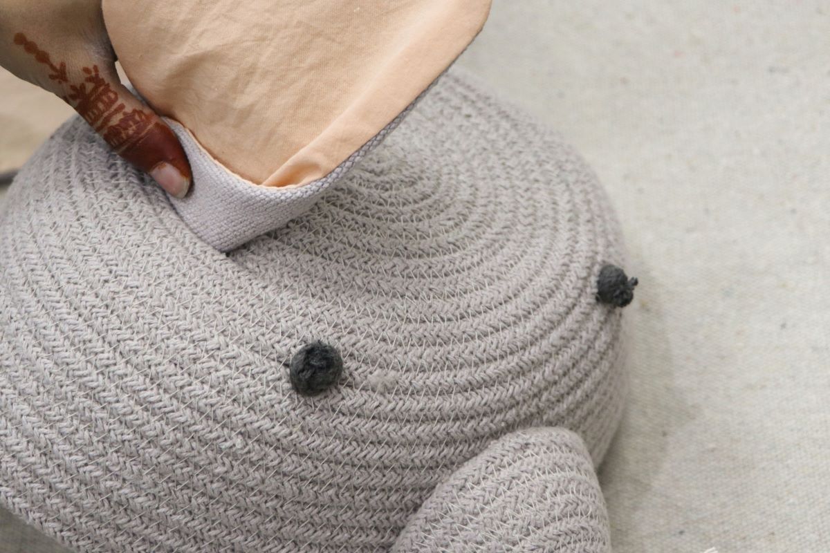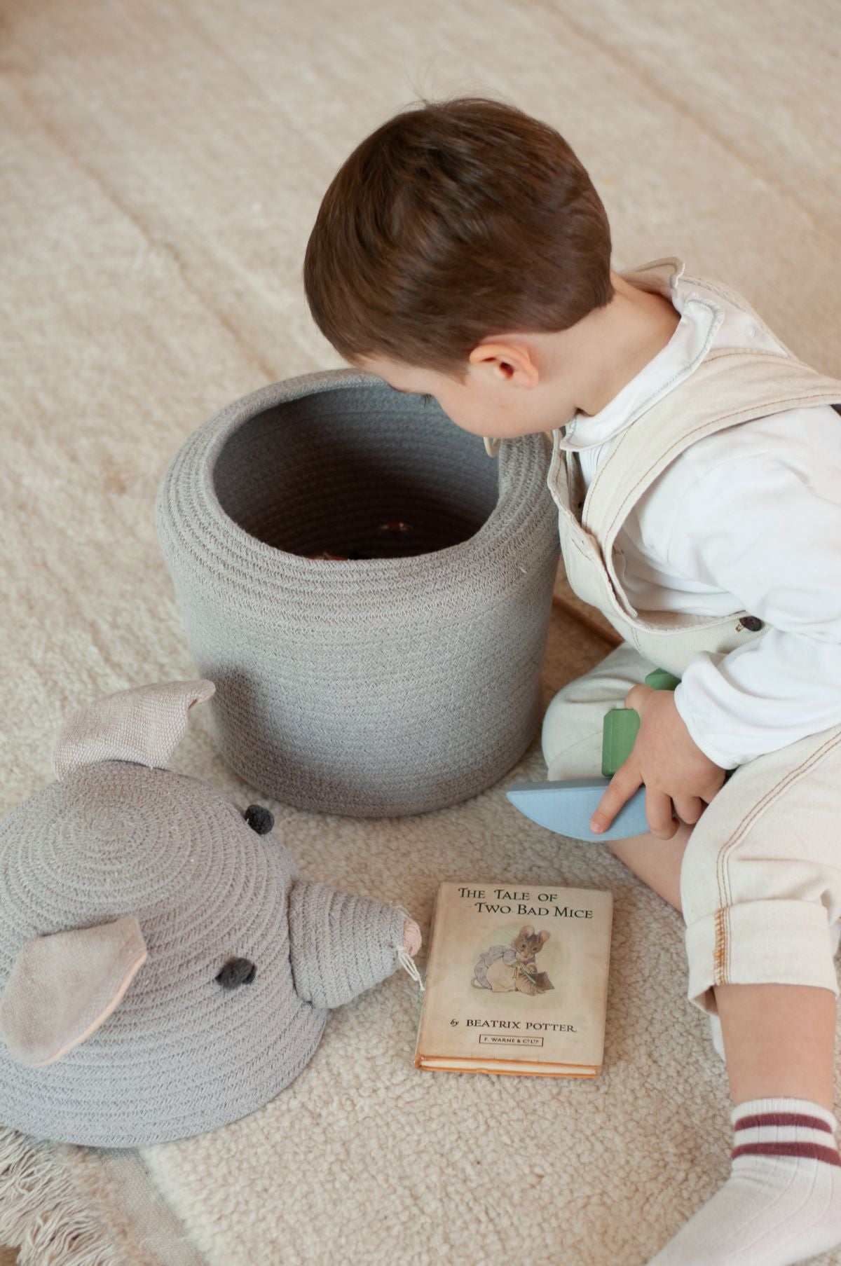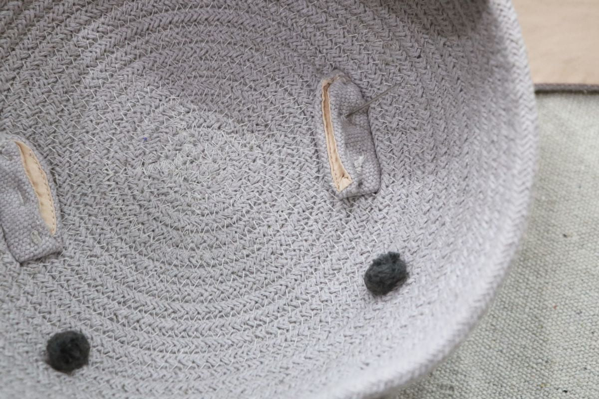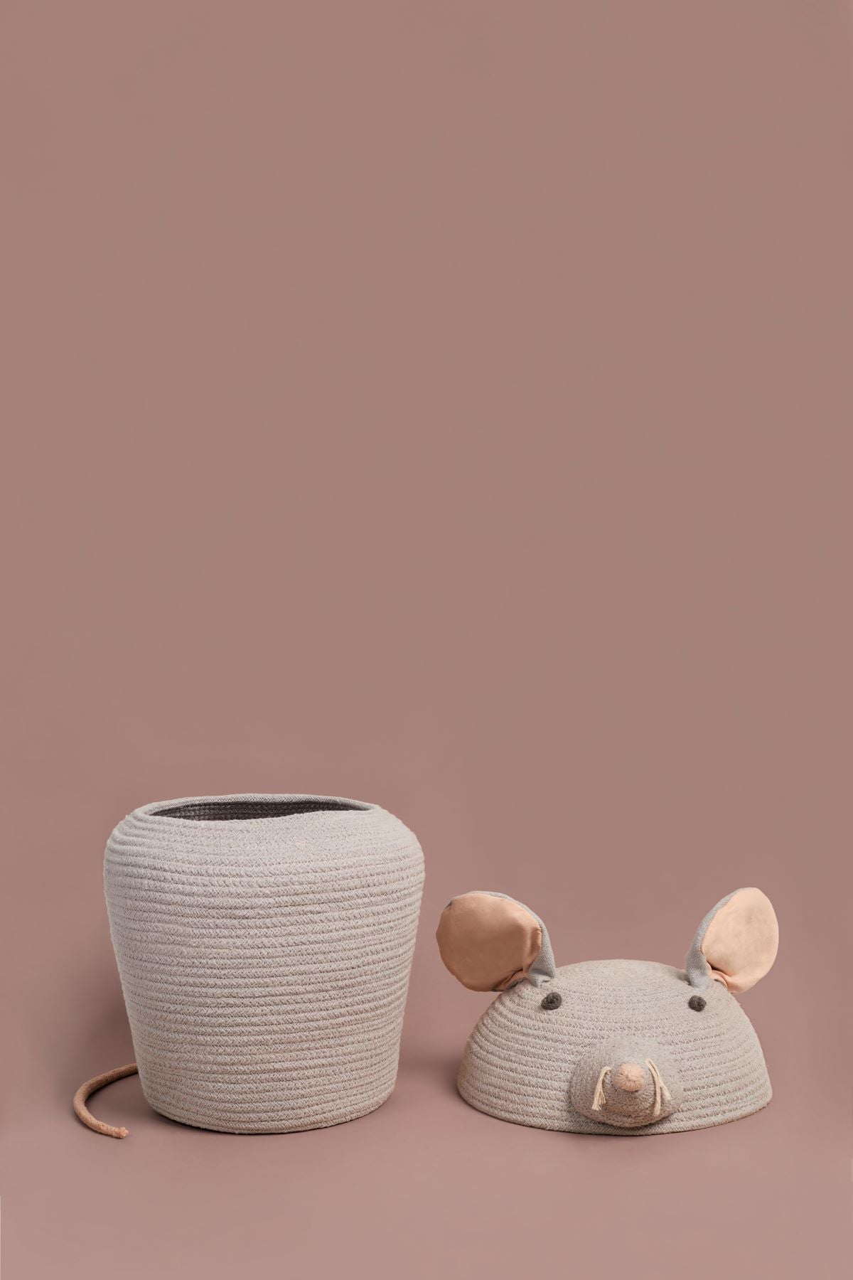 Curious as a rat, the Renata the Rat basket is handcrafted using braided cords made of fibers from recycled PET bottles mixed with our cotton colors. With a slightly cone-shaped bottom part in Pearl Grey color and an embroidered pointy nose, the gray canvas ears and the pink long tail gives the final touch to this basket.