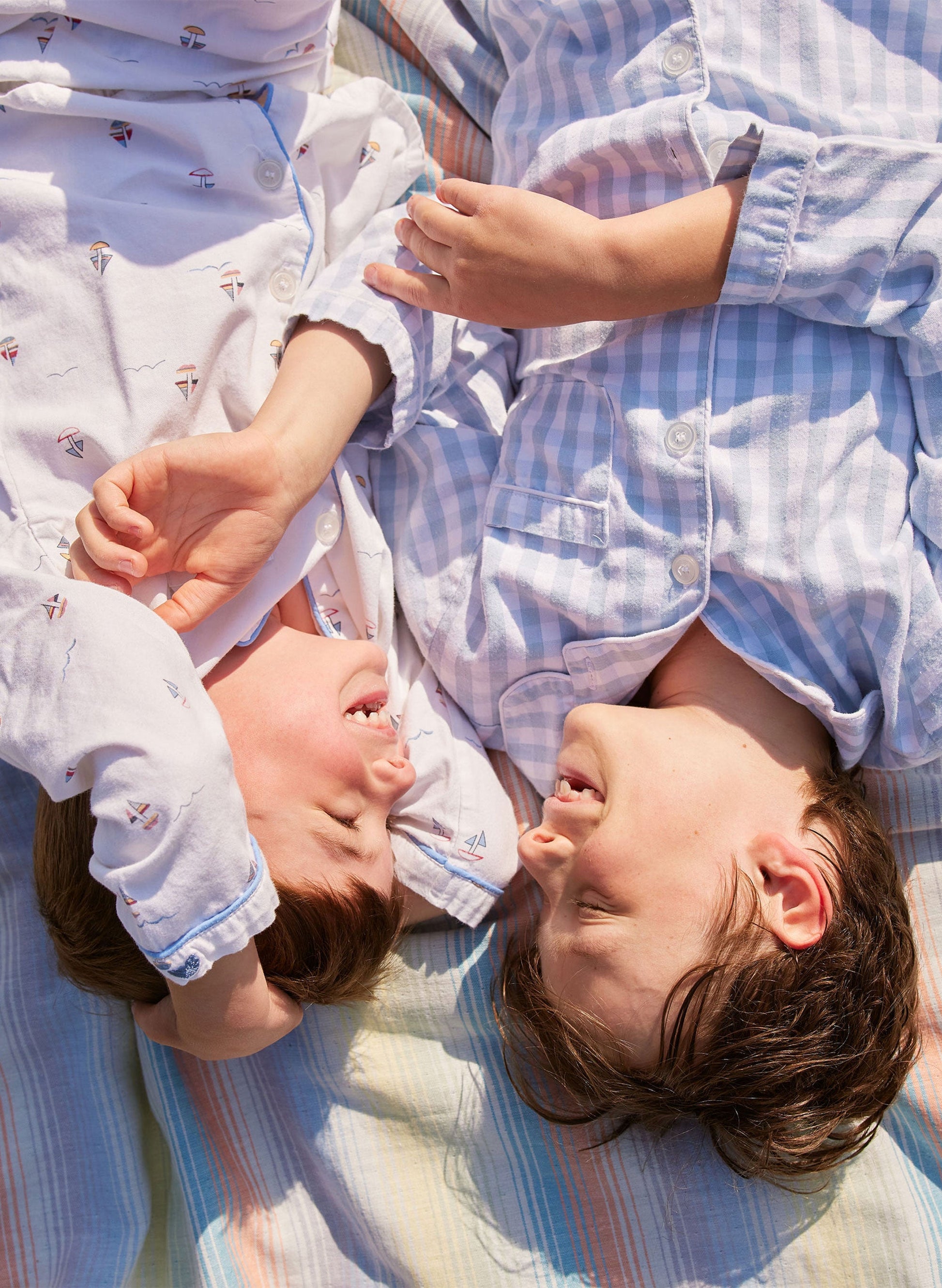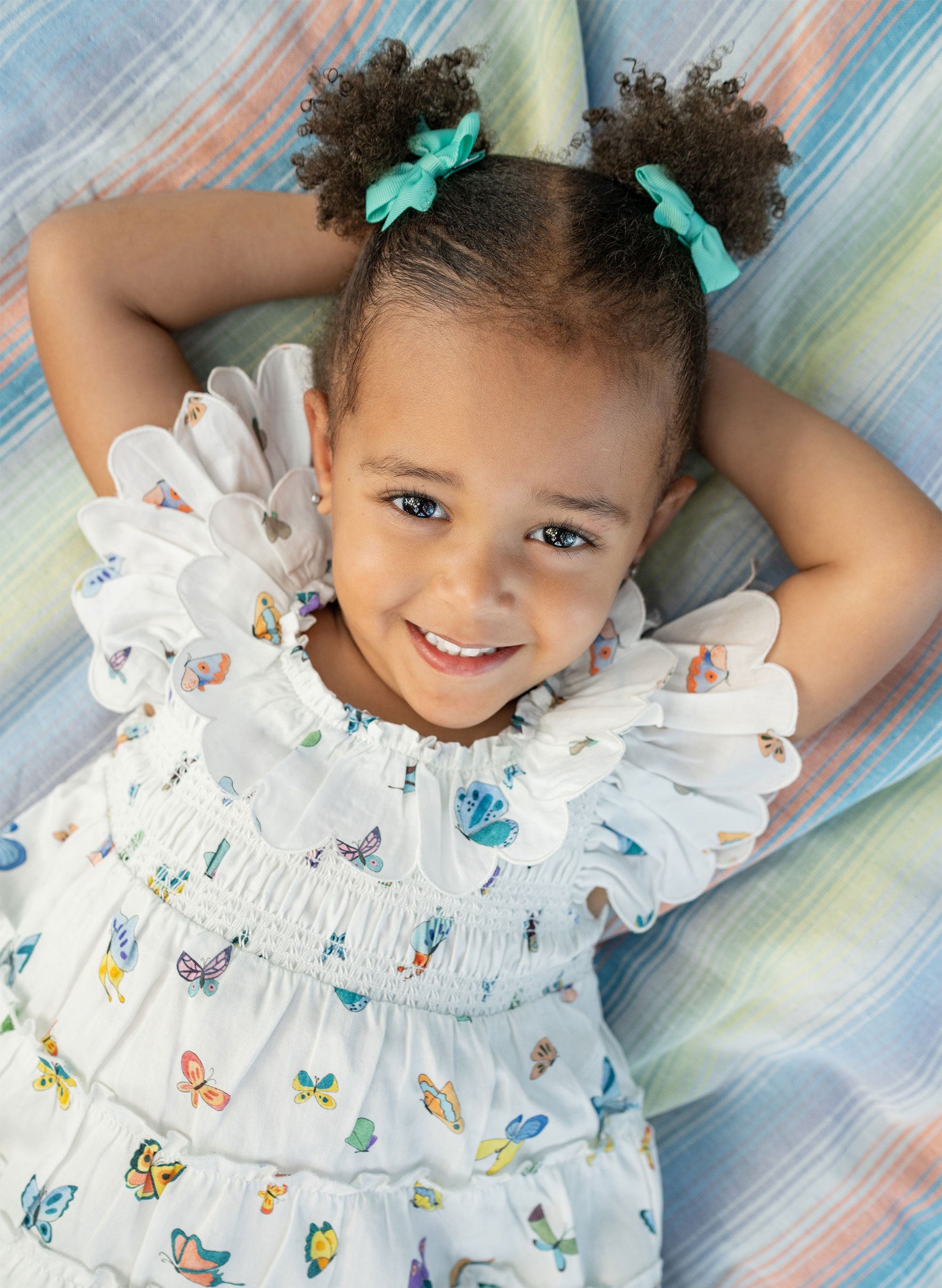 Trips to the beach. Days in the park. Quiet moments at home. Our Toujours Blanket is the perfect companion for all. Trimmed with eyelash fringe, the multicolored jacquard stripes (in Timo & Violet signature colors) feature a flat-woven front with peacock blue terry backing for absorbency. Add personalization to make it even more special, for your little one or as a thoughtful gift.