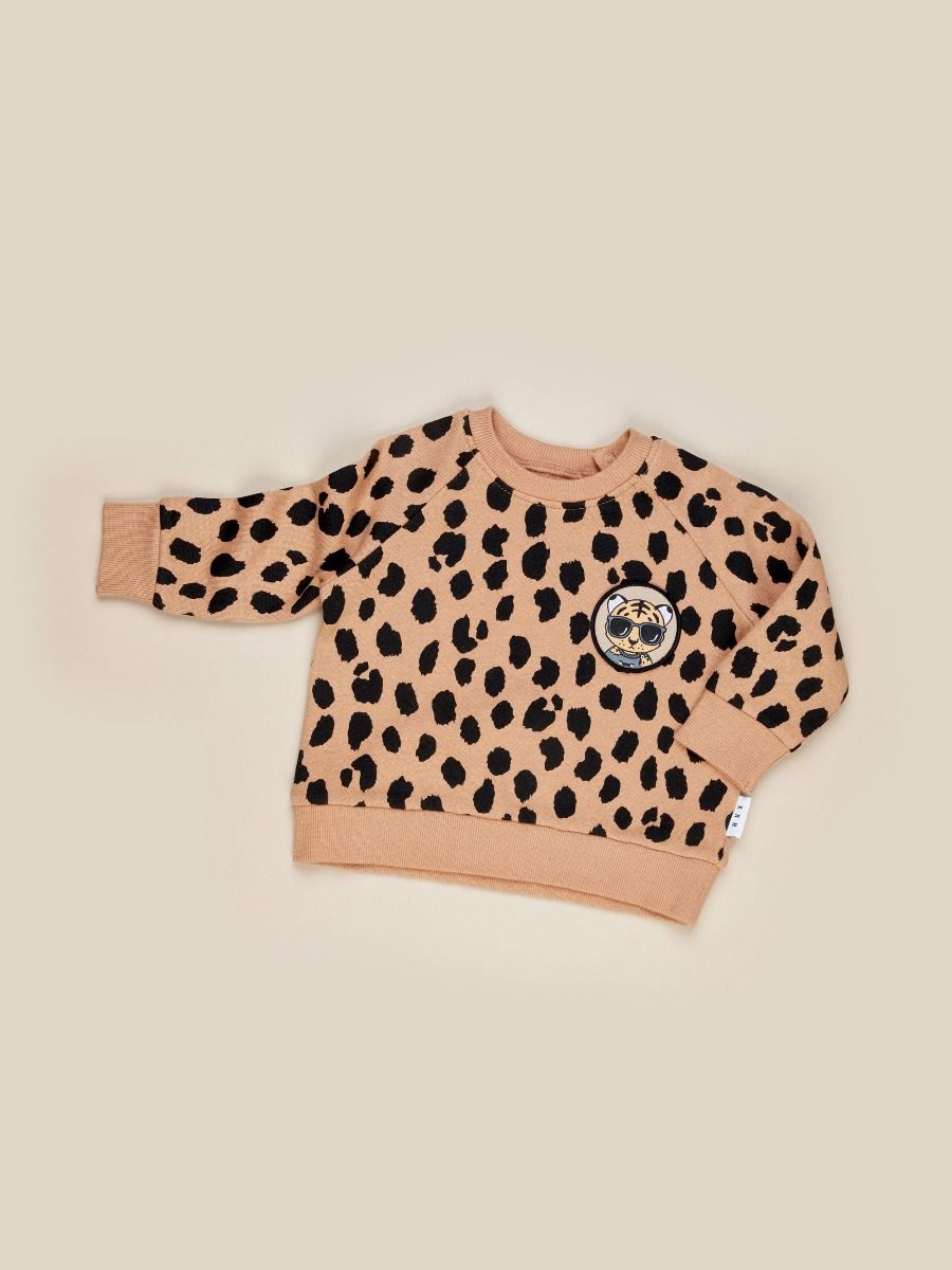 This super soft fleece sweatshirt is perfect for the wild ones. With an all over animal print and tiger patch, and shoulder snaps on baby sizes for easy wear! Made from GOTS certified organic cotton.